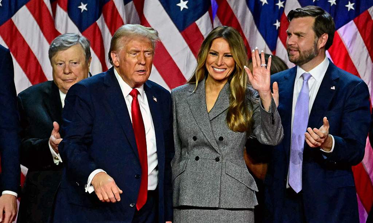 Republican presidential candidate Donald Trump gestures to the audience with his family and running mate at his election night party…