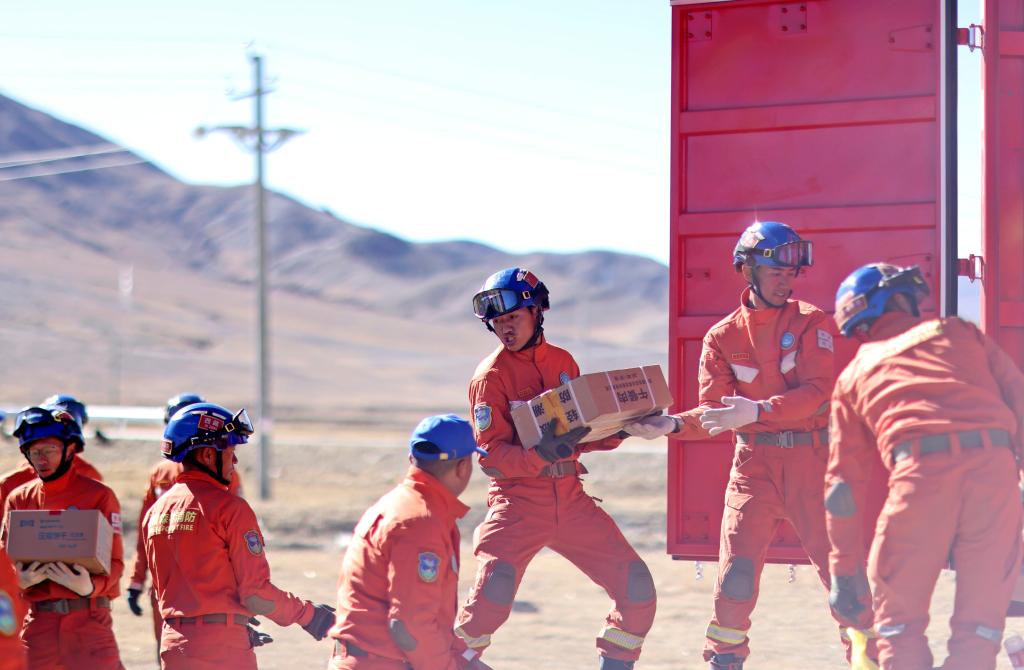 Rescuers unload disaster relief materials in Cuobu Village of Lnaze County, Xigaze, southwest China’s Xizang Autonomous Region, Jan. 9, 2025.…